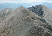 The good path from Glen Torridon leads into Coire an Laoigh. From here we aimed to the left of a band of rock straight ahead in the corrie; a path led to the col north of Stuc Coire an Laoigh and on to the main ridge. An alternative path leads to the col on the main ridge to the east of the summit.