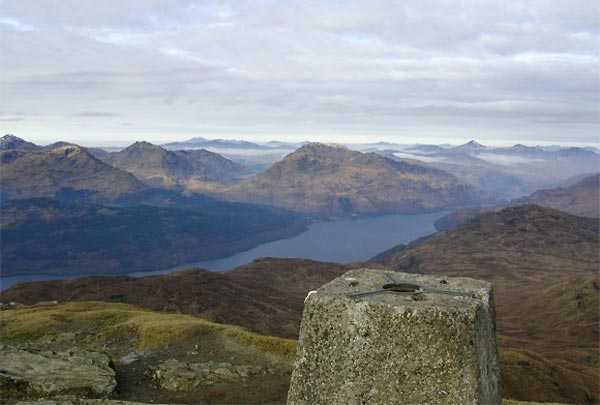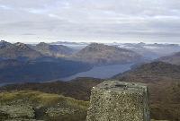 Ben Lomond is a solitary and distinctive peak to the E of Loch Lomond. From the Arrochar Alps, to the NW, Ben Lomond appears to have a conical summit but there is a craggy corrie high on its N slopes. N slopes are steep and craggy but S slopes are easy to moderate. The normal access routes lead from the S and do not encounter the crags until near the summit. Ben Lomond has two parallel SSE ridges, to the W is the Ptarmigan Ridge and to the E the Sron Aonaich ridge. The "tourist" path cuts a broad swathe from Sron Aonaich to the summit. The ascent path by the burn that casacdes between Tom Fitich and Tom Eas at the S end of the Ptarmigan ridge is steeper and much more attractive. Following the Ptarmigan ridge leads to the W face of Ben Lomond from where a minor scramble through rocky outcrops leads to the summit.